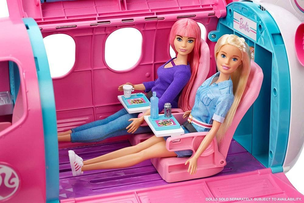 The Barbie Dreamplane is ready to help imaginations take off to anywhere! Kids can push it on its wheels to taxi on the ground or open up the top and side to reveal the inside and play out the ride. Realistic touches, like reclining seats, working overhead compartments and a snack cart with removable trays, are the ticket to role-play fun -- a puppy is the perfect travel companion to share the adventure! Other accessories let kids play out eating, napping or resting while watching entertainment -- flying has never been so easy! Inspired by Barbie Dreamhouse Adventures, fans can peek into the everyday life of Barbie as she embarks on exciting adventures with her family and friends or make up their own stories as they explore the world! Collect other Barbie travel dolls and toys to expand the play possibilities. Young travel lovers will enjoy visiting places near and far and playing out the plane ride, eating, sleeping and entertaining themselves, because when a girl plays with Barbie, she imagines everything she can become. Dolls not included. Colors and decorations may vary.