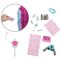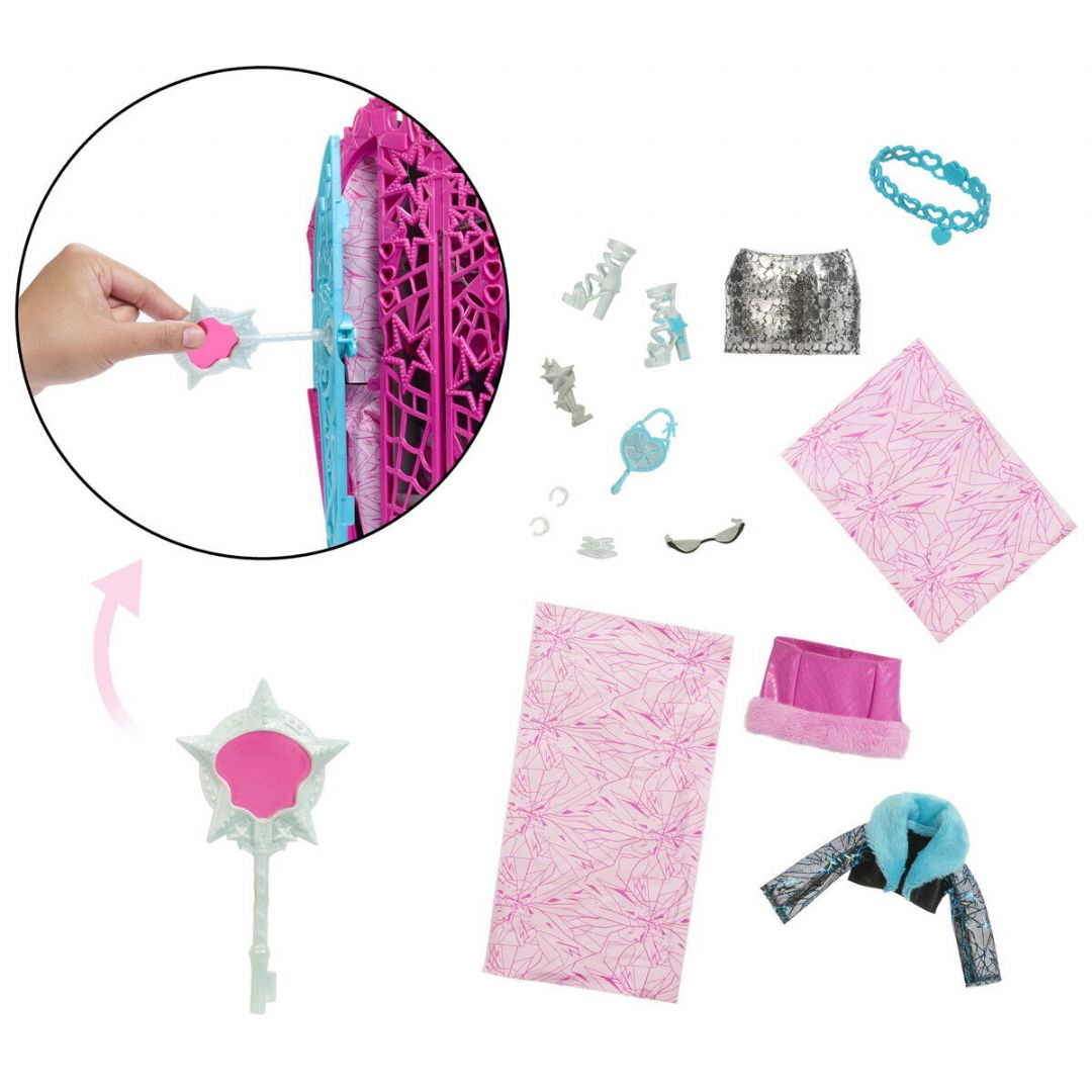 Ratkaise mysteeri, avaa Hauntlywoodin portit ja paljasta Monster High -nukke, jossa on Skulltimate Secrets: Hauntlywood Mysteries! Lapset voivat leikkiä pelottavana etsivänä ja etsiä kartalta johtolankoja maagisella suurennusavaimella. Matkan varrella he löytävät yli 19 muotiyllätystä, kuten kiiltäviä asuja, pelottavan näköisiä kyynärsuojat ja kimaltelevia koruja. Näytelmän päätyttyä 4-vuotiaat ja sitä vanhemmat lapset voivat säilyttää nuken, vaatteita ja asusteita tähtikaappiin, joka sopii sekä säilytykseen että tarinankerrontaan! Kaikki tuotteet myydään erikseen. Täysi liikkuvuus.
