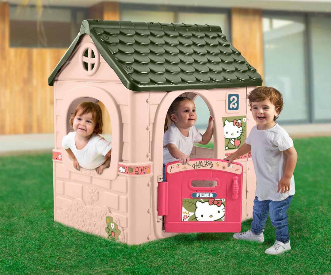 Leikkimökissä on avattava ovi ja suuret ikkunat, jotka tarjoavat runsaasti valoa ja hyvän ilmanvaihdon, joten lapset voivat leikkiä mukavasti tuntikausia. Koristeelliset yksityiskohdat ja tuttu Hello Kitty -teema tekevät leikistä entistä hauskempaa ja inspiroivat luovaan roolileikkiin.