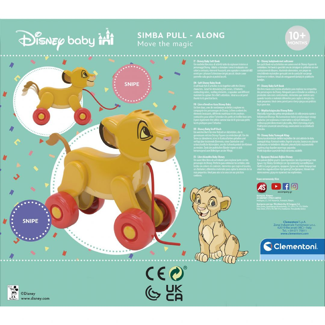 Rakastettava Simba-lelu on täydellinen leikkikaveri lapsille kaikkialle mukaan. Pyörien ja narun ansiosta lapset voivat leikkiä Simban kanssa ja lähteä jännittäville uusille seikkailuille. Kun Simba liikkuu, sen häntä liikkuu ylös ja alas palkitsevalla ja mukaansatempaavalla tavalla. Lelu on suunniteltu auttamaan lapsia liikkumaan ja stimuloimaan heidän mielikuvitustaan. Valmistettu Italiassa kierrätysmuovista. Suositellaan yli 10 kuukauden ikäisille lapsille.