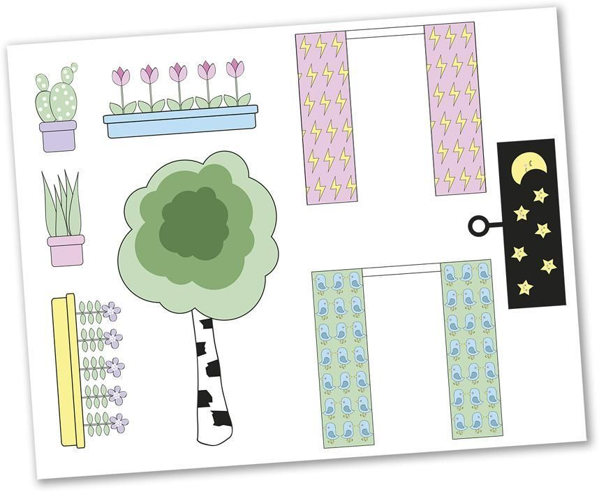 Koristele oma Lundby Creative -nukkekotisi! Näillä tarroilla voit lisätä nukkekotiin kasveja ja verhoja. Tarrat on helppo irrottaa ja kiinnittää uudelleen. Voit liimata tarroja Lundby Creative -nukkekodin sisä- ja ulkopuolelle
