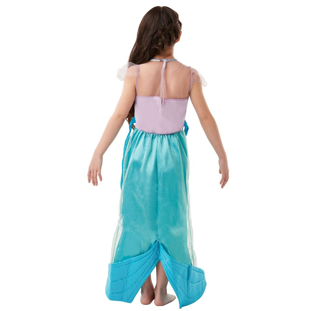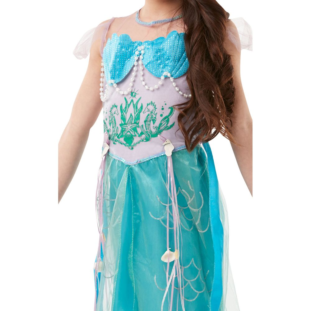 Asu koostuu kauniista mekosta, joka on tyylikkäässä aqua-sinisessä ja violetissa värikombinaatiossa. Mekon leikkaus on elegantti merenneito-tyylinen, joka saa tyttösi näyttämään aidoilta merenneito-prinsessalta. Lisäksi mekossa on simpukankuorimainen yläosa ja nyörilukko olkapäillä, joka antaa asulle ylimääräistä prinsessakosketusta.