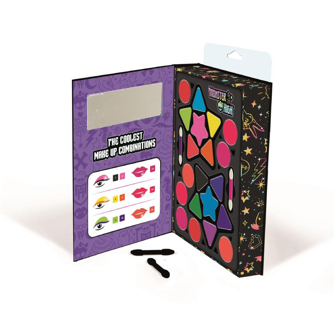 Kokoontaitettava meikkirasia, jossa on luomiväriä ja huulipunaa ainutlaatuisen meikin luomiseen. Setti on täydellinen lisävaruste hauskanpitoon Monster High -hahmojen kanssa. Luova setti mielikuvituksesi vapauttamiseen ja upeiden meikkien luomiseen. Meikki on testattu lasten leikkiturvalliseksi ja se on helppo poistaa vedellä. Vapauta luovuus ja mielikuvitus. Suositellaan yli 6-vuotiaille lapsille.