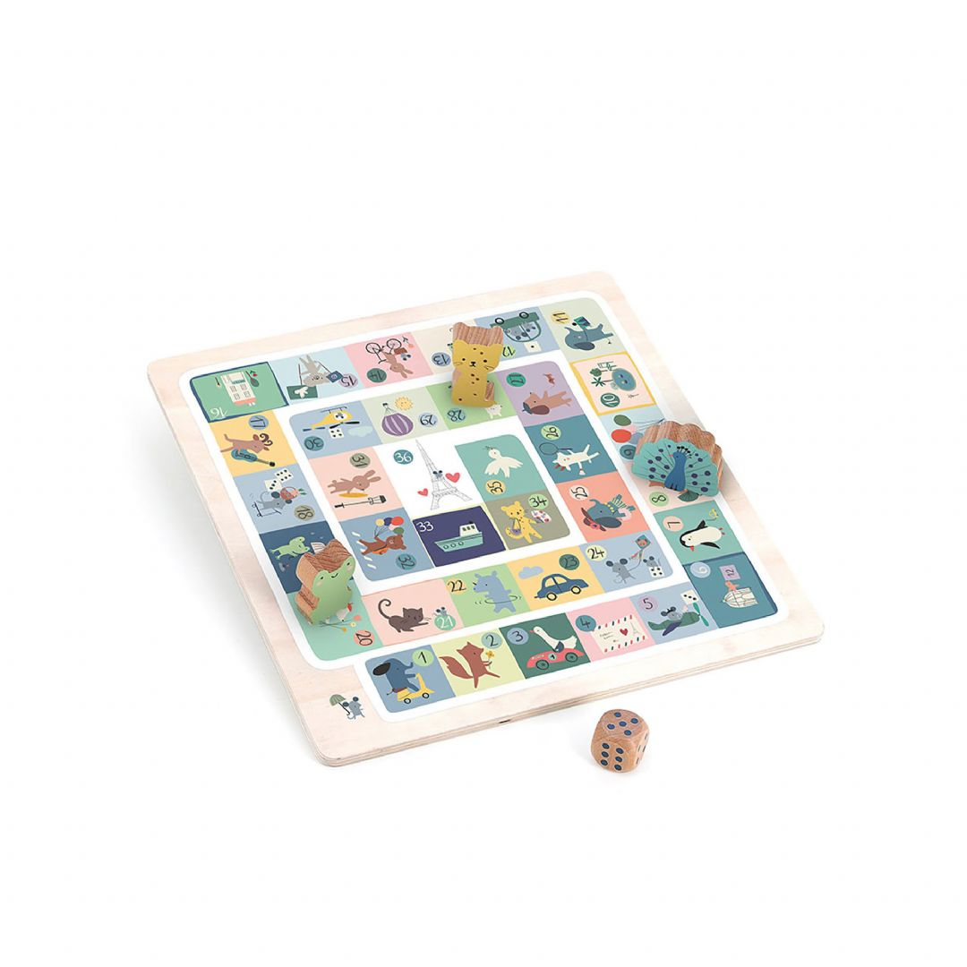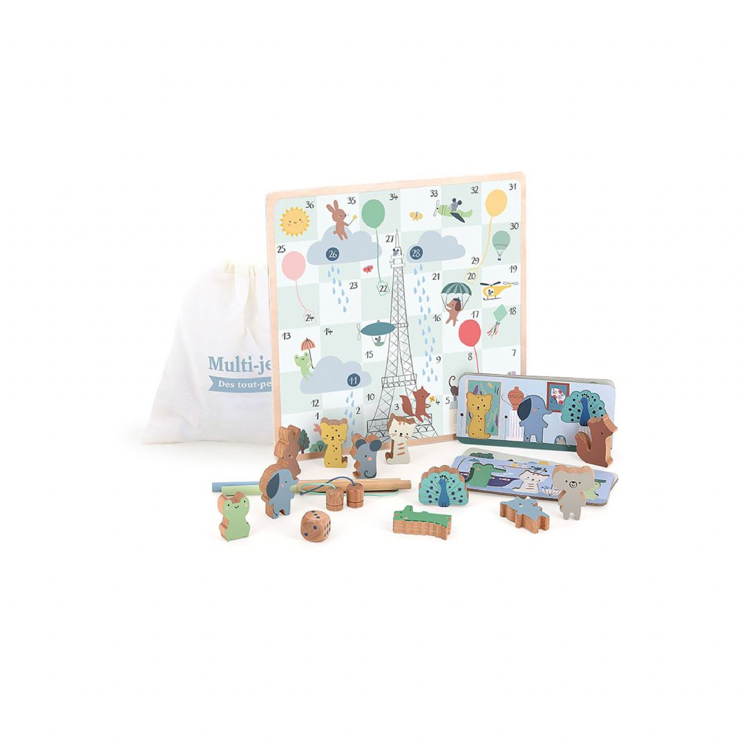 Sarah Betzin kuvittamat monipelilaatikon söpöt puiset eläimet sopivat neljään peliin: hanhipeliin, tikapuupeliin, kalapeliin ja bingopeliin. Jokaisesta pelistä tulee hauska seikkailu, joka sopii erinomaisesti motoristen taitojen ja logiikan stimulointiin ja ennen kaikkea yhdessäolon hetkiin perheen kanssa.