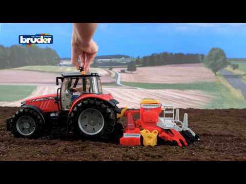 The Pöttinger Vitasem 302ADD combined rotary harrow and sowing machine is used in agriculture for soil tilling and excels at metering the seeds in a particularly swift and exact manner. Sowing with higher precision and achieving greater yields during the harvest is at the heart of this combined unit made by Pöttinger. The model sports an attachment interface which makes it possible to use the combined rotary harrow and sowing machine with all tractors that are part of the product line. Allowing them to raise and lower the unit, the integrated hoisting mechanism lets the children accurately simulate the real-world transport and working position. The optional toy figures offered by BRUDER can climb onto the combined unit using the fold-down stairs in order to, for instance, open the seed tank. Work can begin as soon as the tank is filled, the combination is hitched up to the tractor and the outlet valve is open. Scores of details bring the visual effect of this toy to the fore, allowing the children to play in an even more realistic way.