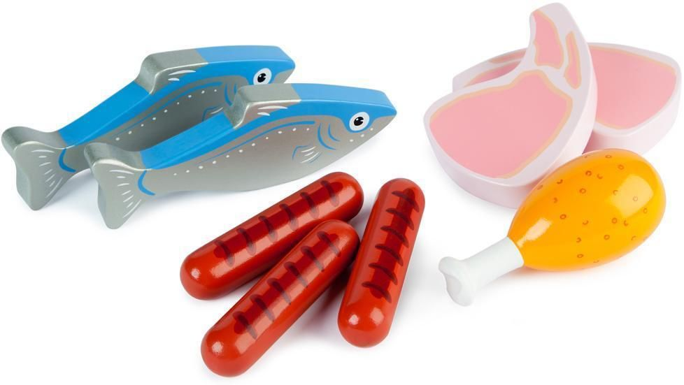 Tidlo puinen ruoka liha ja kala on fantastinen leikkiruokasarja, joka sopii täydellisesti lapsille, jotka rakastavat kaupan tai ruoanlaiton leikkejä. Tämä leikkiruokasarja tulee kauniissa puulaatikossa kätevällä kantokahvalla ja sisältää kaksi kalaa, kaksi pihviä, kolme makkaraa ja mehevän kanan koiven, joilla lapset voivat leikkiä.
